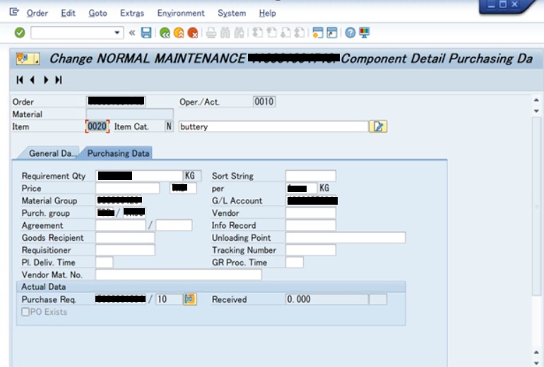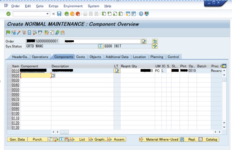 必須項目を入力し、コンポネントをダブルクリックするか、[Purch’ ボタンを押下し、購買依頼が作成されていることを確認。