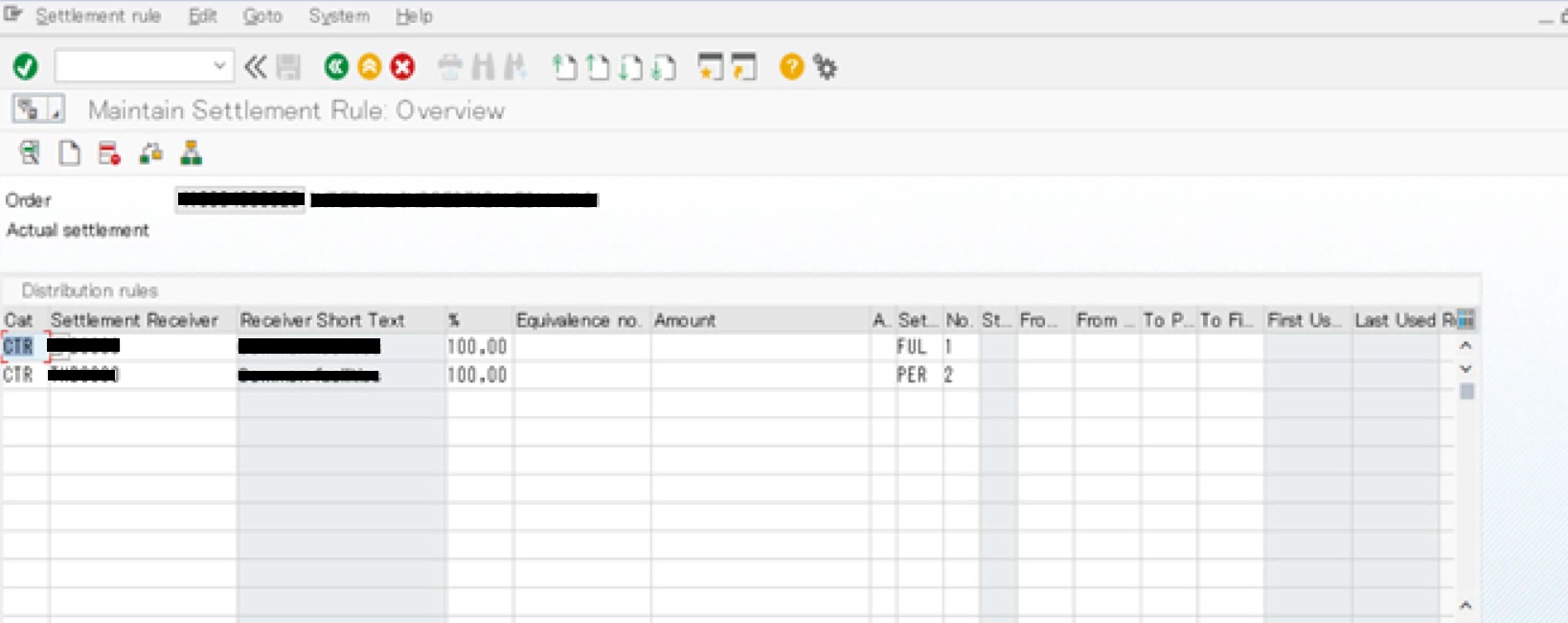 | 1 | Category* | 決済ルールのレシーバのカテゴリを選択、例えば、CTR(原価センタ)、WBS、ORD(指図) |